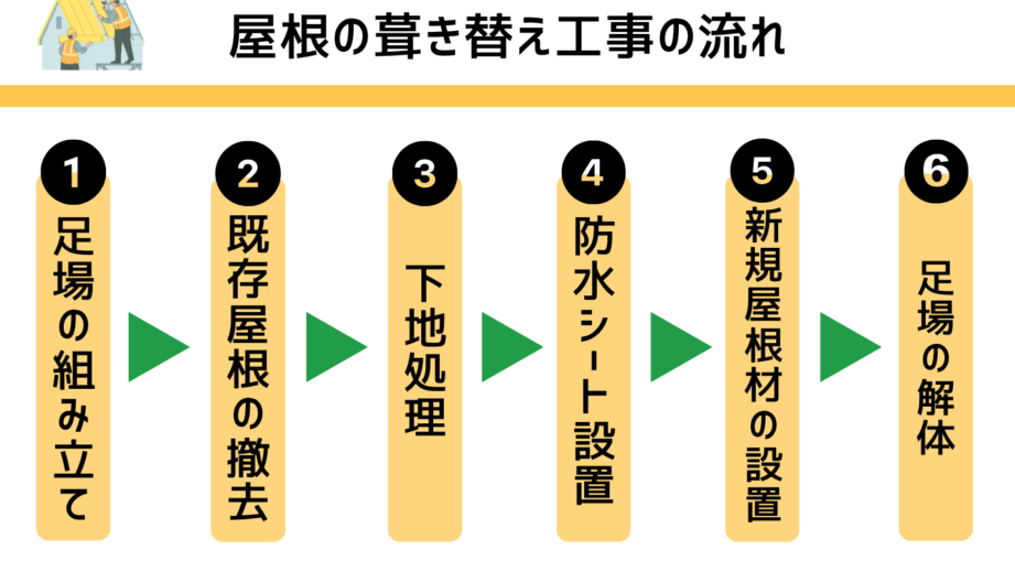 - 新しい材料を取り付ける。適切な手法で新しい屋根材を固定します。