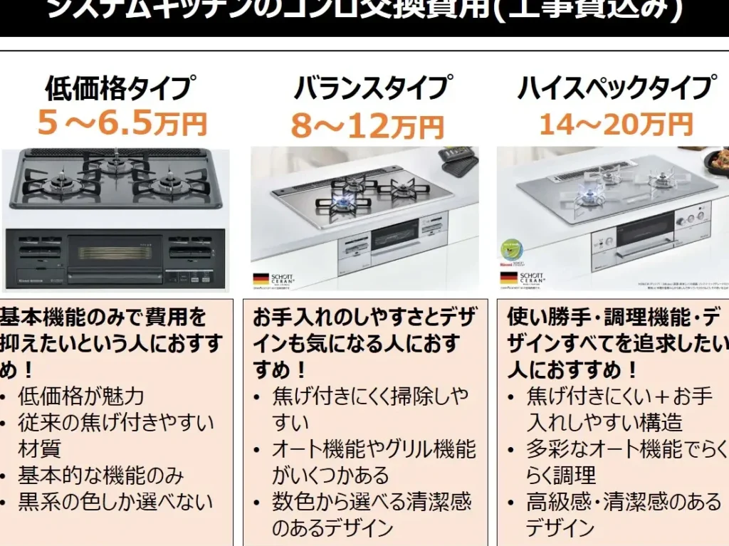 - 買い替え費用を見積もる。新しいガスコンロの価格帯は20,000円〜100,000円です。購入時のセットアップ費用も計算に入れましょう。