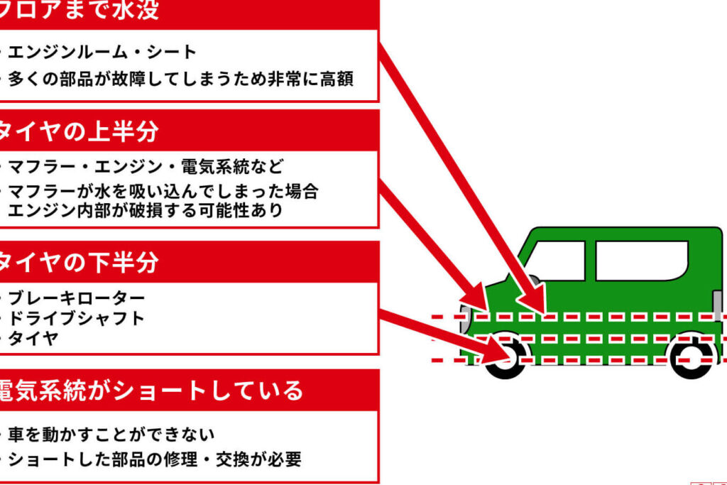 - 浸水の程度を確認する。水が車内にどれだけ入ったか、またエンジンや電装系に影響を及ぼしたかを評価します。