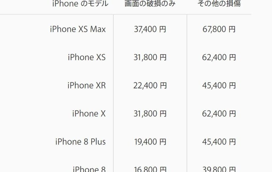 Appleの公式サービスを利用する場合、修理代は以下のようになる。